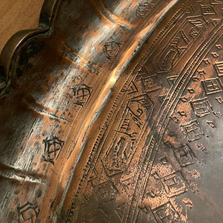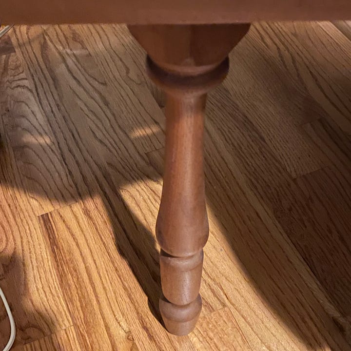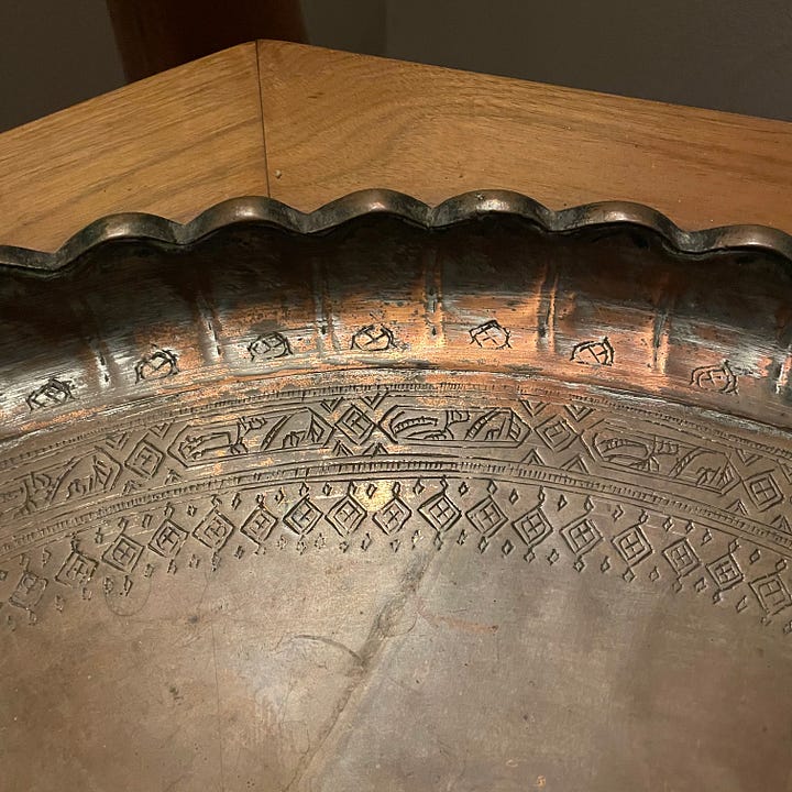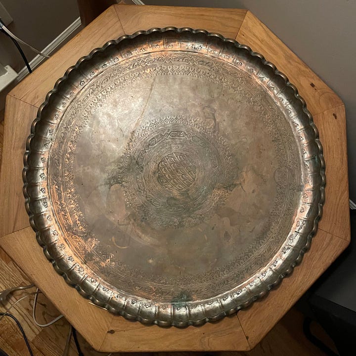 I am working on two family history projects—the journals of my great-grandmother Emma, who started writing in rural Iowa in 1927, and the letters of my great-aunt Katharine, who—among other things—taught school in Tehran before the Iranian Revolution. This week they intersected in the story of this table, which my grandfather (Emma’s son-in-law) made from a platter K brought back from Iran. He turned the legs and built the frame from reclaimed walnut.